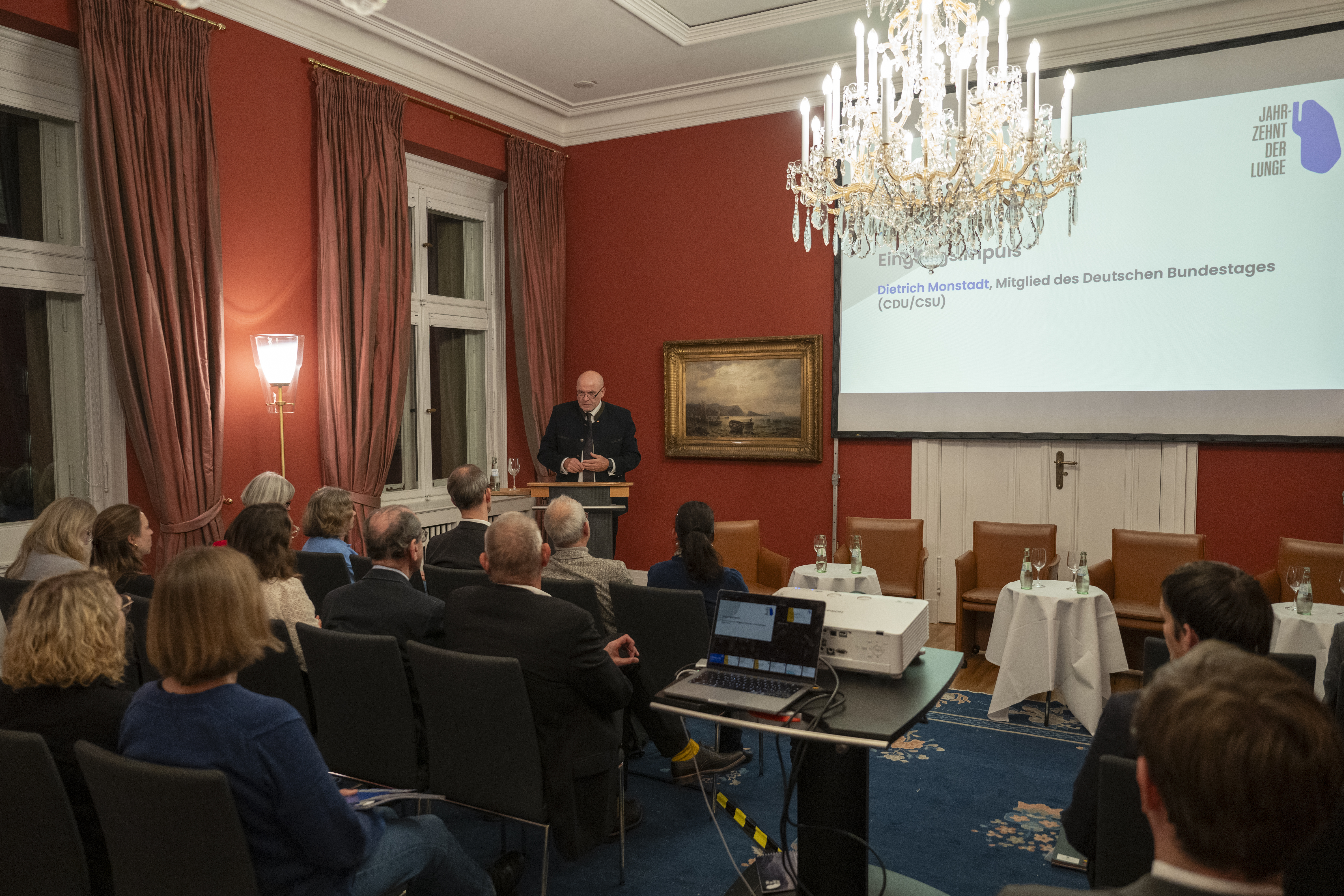Am 3. Dezember 2024 trafen sich in Berlin unter der Schirmherrschaft von Dietrich Monstadt, MdB (CDU/CSU), politische Entscheidungsträger, Expert:innen und Patient:innenvertreter:innen beim Parlamentarischen Abend des Jahrzehnts der Lunge, um über ein drängendes Thema zu diskutieren: chronische Lungen- und Atemwegserkrankungen. Sie betreffen allein in Deutschland über 14 Millionen Menschen, und die Zahl der Betroffenen steigt kontinuierlich. Im Rahmen der Veranstaltung wurden konkrete politische Handlungsempfehlungen zur Verbesserung der Prävention, Früherkennung und Versorgung von chronischen Lungen- und Atemwegserkrankungen, um diese Erkrankungen mit Blick auf die Bundestagswahl 2025 diskutiert.